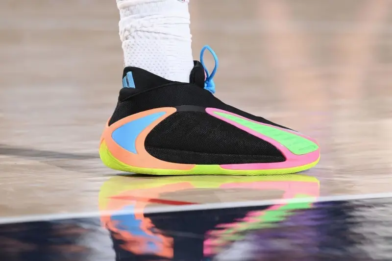 比赛中,爱德华兹上脚彩色adidas AE2。