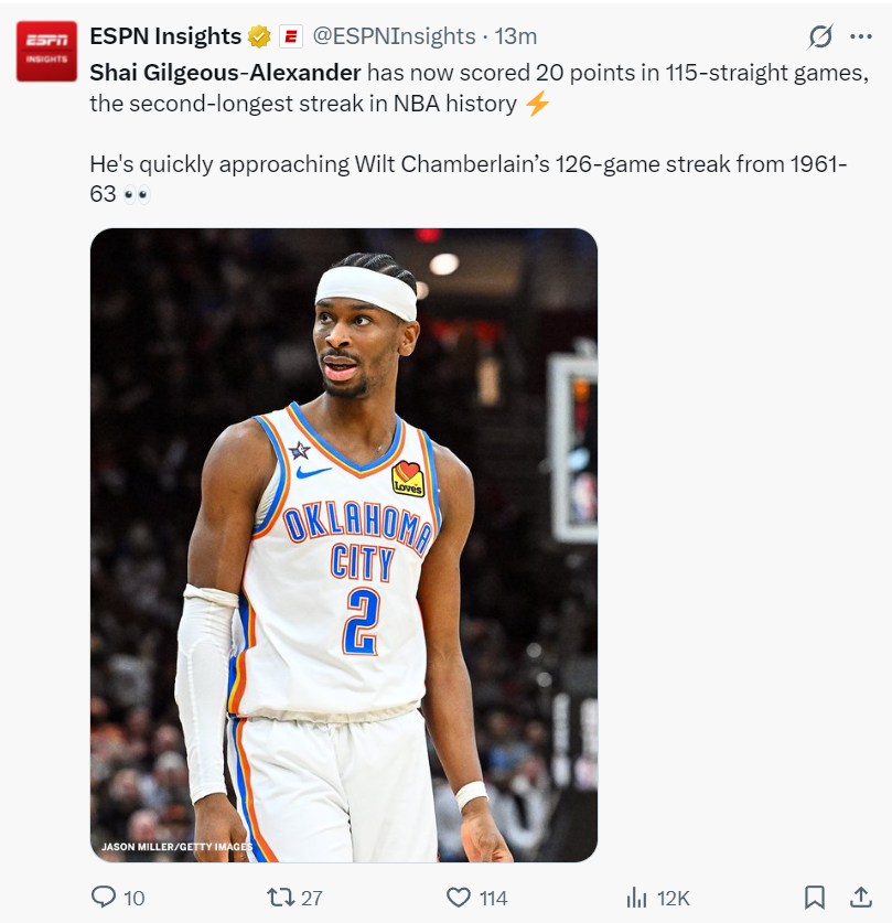 亚历山大此役也达成了连续115场20+的纪录历史第二,他距离1961-1963赛季的张伯伦126场只差15场了。